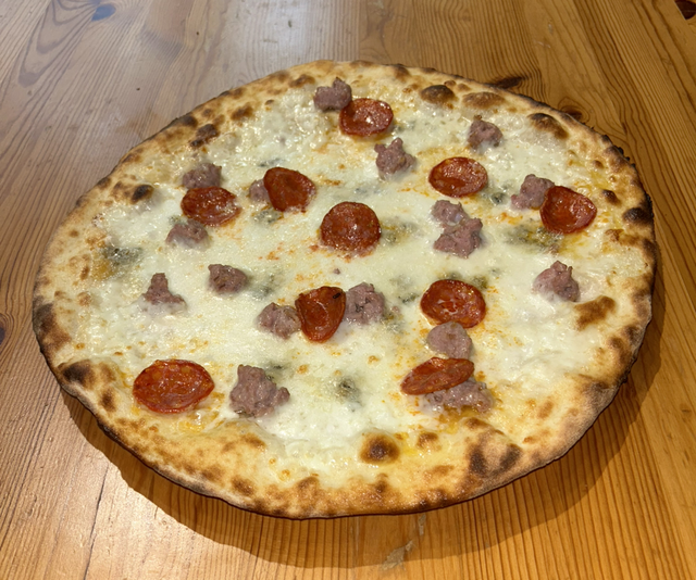 mozzarella fiordilatte, salame piccante, salsiccia e gorgonzola